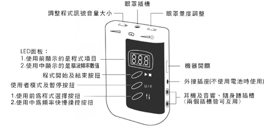 如要调整光罩眼镜所呈现的光度及音量,请调整机器上方的左右开关。